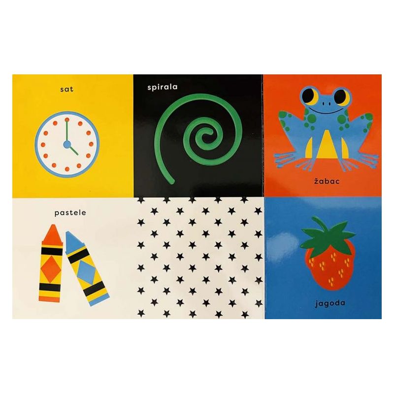 Vrlo male bebe okolinu vide posve drukčije od nas i upravo je zato razvijena ova jedinstvena serija slikovnica koja se oslanja na znanstvena istraživanja o razvoju vizualne percepcije u dojenčadi. Svaka slikovnica ove serije predstavlja kartice u visokokontrastnoj paleti boja s prikazom posebno oblikovanih likova, predmeta i uzoraka. Prikazane slike sadrže elemente poticajne za vizualnu percepciju, kao što su ponavljanje, uočavanje vizualnih obrazaca, simetrija i zaobljene linije – sve što privlači bebinu pažnju. Jarke, kontrastne palete boja, uz crnu i bijelu, prilagođene su očima dojenčadi. Zato ove slikovnice izgledaju posve drukčije od tradicionalnih kartončica za bebe. Slikovnice iz ove serije namijenjene su poticanju ranog vizualnog razvoja kroz ciljanu i optimalnu senzornu stimulaciju.